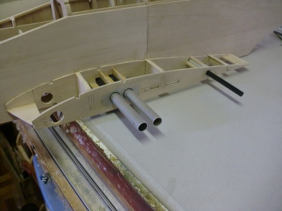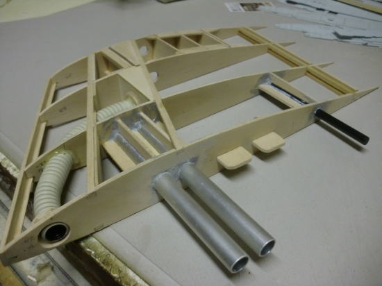 ● 主翼のセンター側(インナーウィング)の内部補強と各種部材の取付を行っています。カンザシと成るメインのアルミパイプ・サブカンザシと成るカーボンシャフトを其々確実に固定する為の接着固定を行いました。使ったのはクイックメンダー(5分硬化タイプ)5分で硬化が始まるので、とにかく塗り込む前の段取りを入念に行い作業開始です。要は丸いパイプ周りの角孔の隙間を埋めれば良いんです。塗り込んで30分も経てばパイプに付着した接着剤は、カッターナイフの刃先で難無く剥ぎ取れるので作業は楽です。更に2時間経過後は、粗めのサンドホルダーで削ると画像の様な見た目と成ります。確実に仕上げるなら、更に時間をおいてから細かな修正をすれば見た目はもっと良くなります。