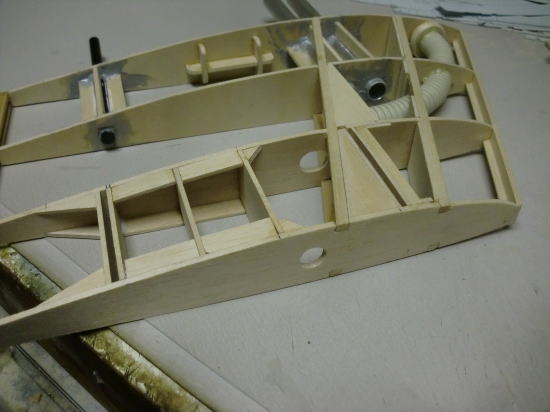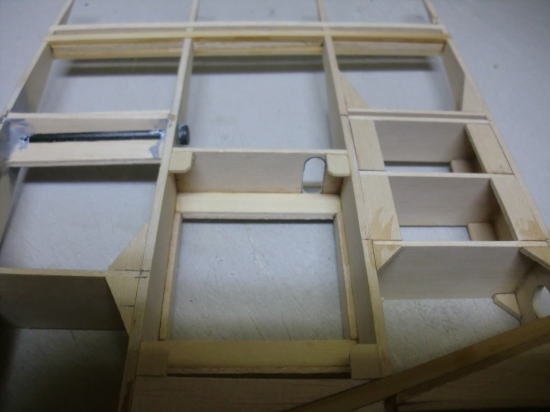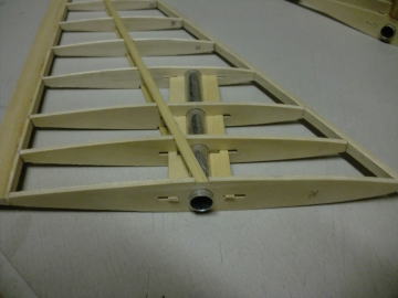 ● スタビライザーの駆動パイプの前後を補強します。形紙の段階で、パイプ孔の前後中心線に2×10mmの孔を開けるべく、最初から角孔を切り取ってあります。此処をトレースして切り抜けると画像の様な案配に・・・。此処にリブピッチに合わせた切り溝を入れて刺し込みスライドさせれば、立派な補強部材の取付が出来ます。後からリブピッチごとの補強材を一枚ずつ貼り込んでも結果は同じ・・・。今回はメインスパーと補強部分が交差するんで・・・この方法を使ったまで。