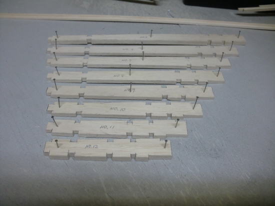 ● 中々前に進まない製作記事・・・。今回、OK模型から仕入れたハード系のガチンコバルサ・・・そら!もう!~滅茶苦茶硬いバルサ使って治具を組む・・・。ベニヤよりも反りが少なくかなり正確な治具が作れる事が判明・・・。画像のリブ材、手前が2番リブ・・・2番と3番は3mmベニヤ、4番と5番は3mmのハードバルサ・・・此れは目から鱗ですなあ・・・。大きな声では言えないが、木村のハードバルサよりも木目の筋が良く、それでいて滅茶苦茶硬い・・・糸鋸盤を使った加工が大変楽なんですなあ・・・。