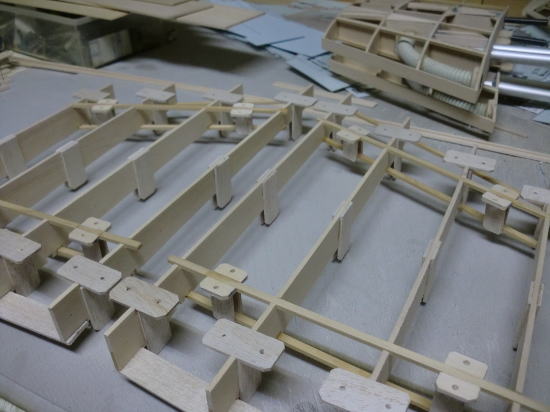 ● 当工房のリブ組み治具の最新版を使うと、治具に固定した状態である程度の部品取り付けが可能に成り、治具から外してもその形状を強固に維持出来るんです。其処から更に部品を取り付けて行きますが、治具から外したリブ組み状のプランク前の主翼なんですが、既にフニャフニャと捻じれる様な構造では無いので、裸の状態でも部品取り付けが可能なんです。OK模型のフィルム張り完成機のバルサ機の場合も、此れと同様です。リブ組み状態で、保管しても経年変化での捻じれ等が起き難い構造で組み立てて有るんですなあ。自作モデラーさんの手抜き前提超軽量な主翼の構成では無いんです。