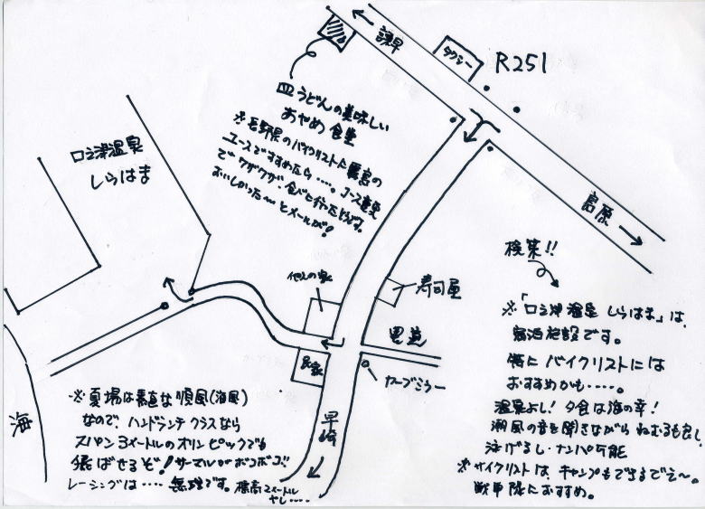 ● 集合時間を18時30分に設定したのは、暗くなり過ぎると間違って早崎まで行っちゃう人が続出します。大卒出のカーナビならばちゃんと手前から誘導するんですが、高卒のカーナビさんなら細かい指示はウザったくて「行けば解かりますよ!。」って答えますので大卒出のカーナビじゃ無い人の為の地図です。自転車にカーナビ装備してる戦車隊はまだ見た事はありません。戦車隊のサイクリストならアナログの折り畳み地図だよな?。下敷きサイズのモバイルなんかをフロントバックに差し込んだ新人類は、惑星エンドア辺りを走って下さい。