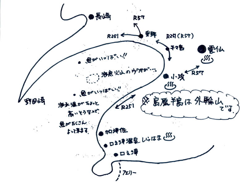 ● 阿蘇山が数年前に噴火した際、有名な火山学者氏が島原半島の橘湾を指示棒でなぞりながら円を描きました。なるほど!だから千々岩町から愛野展望所までの国道は切り立った崖に沿って、国道が走っています。って今更何を言ってんねん!。昔から疑問だったんですが、日本地図見た時に火山の分布図を調べていて疑問に思っていたんですよ。小学校高学年の頃から。だから掘れば温泉は出る可能性があります。口之津温泉は1000メートル近く掘ったと聞きました・・・。個人でトンビ家の庭に1000メートル掘れれば私は自宅を「トンビ温泉」と名付けるでしょう。多分・・・2メートル素掘りして即諦めます。間違って不発弾とかキリシタンの人骨とか掘り当てた日には大変な事態になるでしょうから・・・。