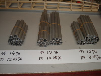 ● 左の画像はキット付属の5mmの焼き入り鋼材のカンザシにホームセンター購入の竹柄のナイロンパイプを組み合わせた簡易型のカンザシセットです。スパン2500mmのオリンピックはこの組み合わせで充分です。最初右の方に見えるナマクラの捨てんシャフトをカンザシにしたらショックコードで曳航中にステンシャフトが曲がってしまいました。5mmと言えども主翼に掛かる風圧は相当の力です。右の画像はベアリングシャフトの寸法切りの残りなんですが、12mmシャフトの分で100mmあたりの重量が100gですので短く加工すればシャーレーレーシング機のバラストとして使用出来ます。カンザシパーツを入手出来ない地区にお住まいのマニアには此方で購入してあげても良いですので、メールでご注文ください。この際、シャフトは定尺での購入となります。勿論アルミパイプも同様です。