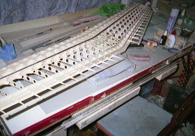● 上記画像の機体は1/5スケールの飛燕なんですが、エンジン部分がバルサ組みのスピンナーになっています。この機体はスパン(翼長)2000mmの無動力スロープスタント機の試作モデルです。大変重厚なので重く見えるんですが・・・自重2250gしかありません。計算上では翼面荷重からいけば・・・最大3200gの仕上がりで風速7mから普通に飛行が可能です。風速17mまで飛行が可能な実践は済ませてあるんですが、事実・・・台風みたいな風力の日に・・・御山に登って飛行機を飛ばすお馬鹿さんが居るとは思えませんので、風速10m程度の強風域の日に機速を殺さない様に走らせて飛ばすとかなり実機に近い雰囲気で飛ばせるかと思います。スロープグライダーの定義(御山で浮く物全部)の意味が解かりますか?。
