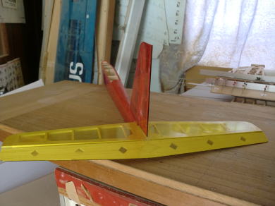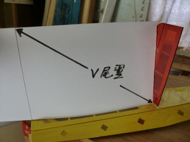 ● V尾翼のサイズを算出する場合は、機体の上面図で水平尾翼の片翼のスパンと垂直尾翼の先端までの位置を求めます。此の寸法の対角線上の二つの角までの長さが、V尾翼に必要なスパンとなります。通常レギュラー尾翼の垂直尾翼を使わず・・・単に水平尾翼をV字にしても、尾翼面積の不足でコントロールが難しく(殆ど出来ない)なります。Vの角度も垂直尾翼から片翼50度~60度(転回角度で100度~120度)が適正とされています。角度が多き過ぎるとエレベータの反応が鈍くなり・・・角度が浅いとラダーの反応が鈍くなります。