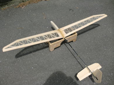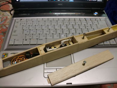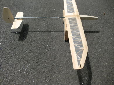 ● 大御所製作の実験機の特徴なんですが、主翼の前縁側はバルサのムク材を翼型に削って仕上げてあります。リブ組から後縁までは何と直線です。所謂・・・層流翼です。揚力係数は若干下がりますが、翼自体が薄いので走らせながら揚力を稼ぐ機体だと言えますね。翼型の部分プランクではないので、部分プランク特有のリブ間の凹みがありません。部分プランクでフィルムを貼ると、初心者さんは大いに悩むんですよね・・・。でも・・・貼り方が悪いんじゃなくて・・・神様が悪いんですよ。この世を作った神様が!。