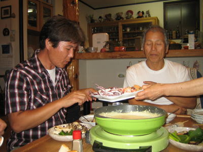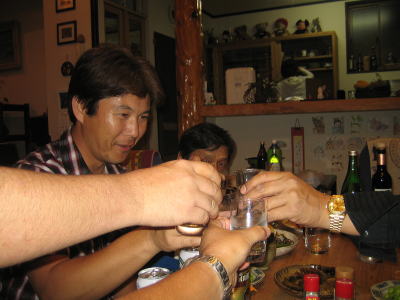 ● やっと宴会スタートです。と言っても・・・既にお仲間さん陽気になってます。準備中のハイオク補給で既にエンジン全開です。陽気になれば少々の不思議な料理と不思議な味も何のその!・・・これが何時ものガルウイングの食事会です。因みにガルウイングってどういう意味なのか・・・。ガルガルうるさい鳥の群れという意味です。寄って集って意見を出し合い完成を目指す・・・私のテストフライヤー氏の集まりって事ですよ。皆さんご存知のコテコテで頑固な面々ばかりでしょ。